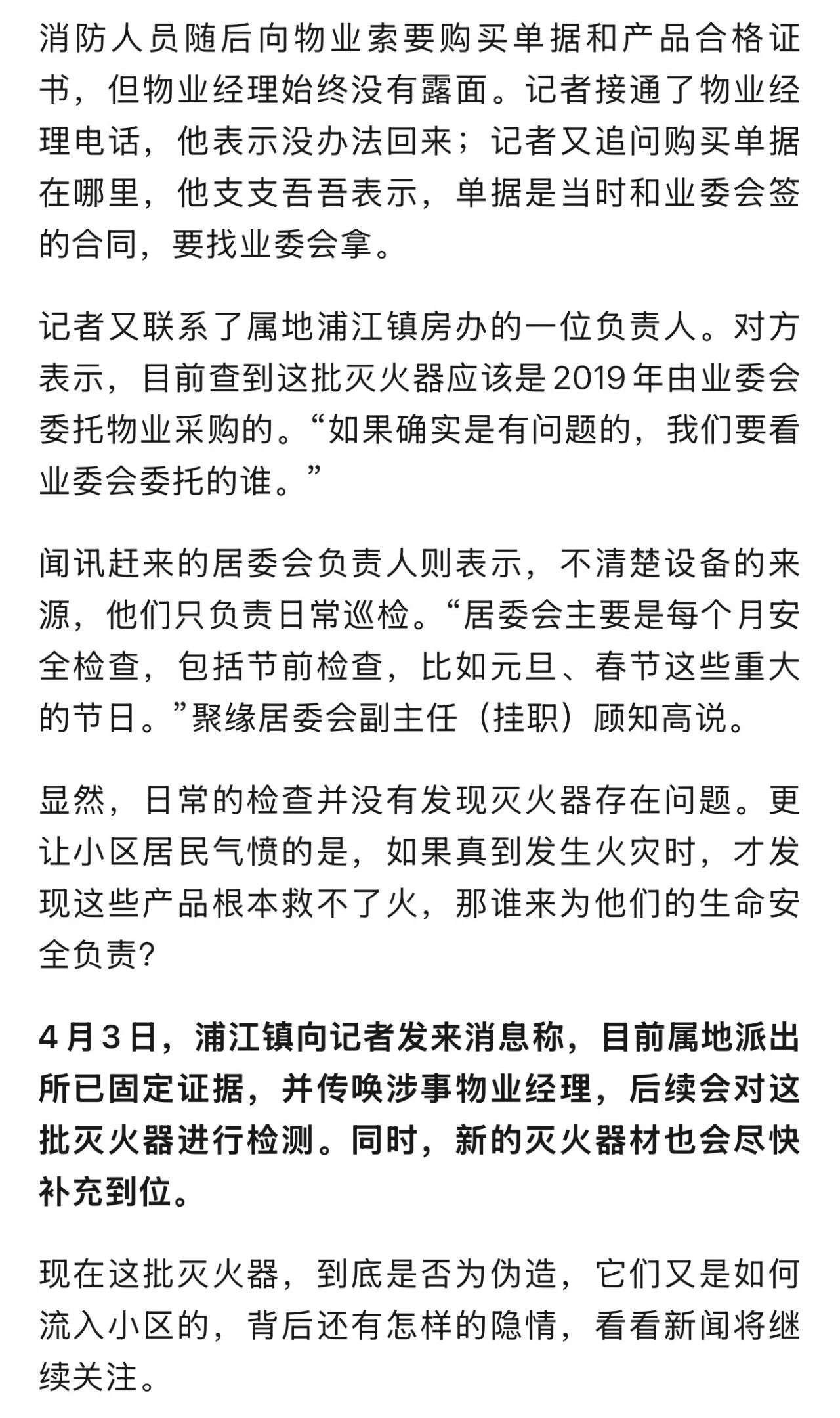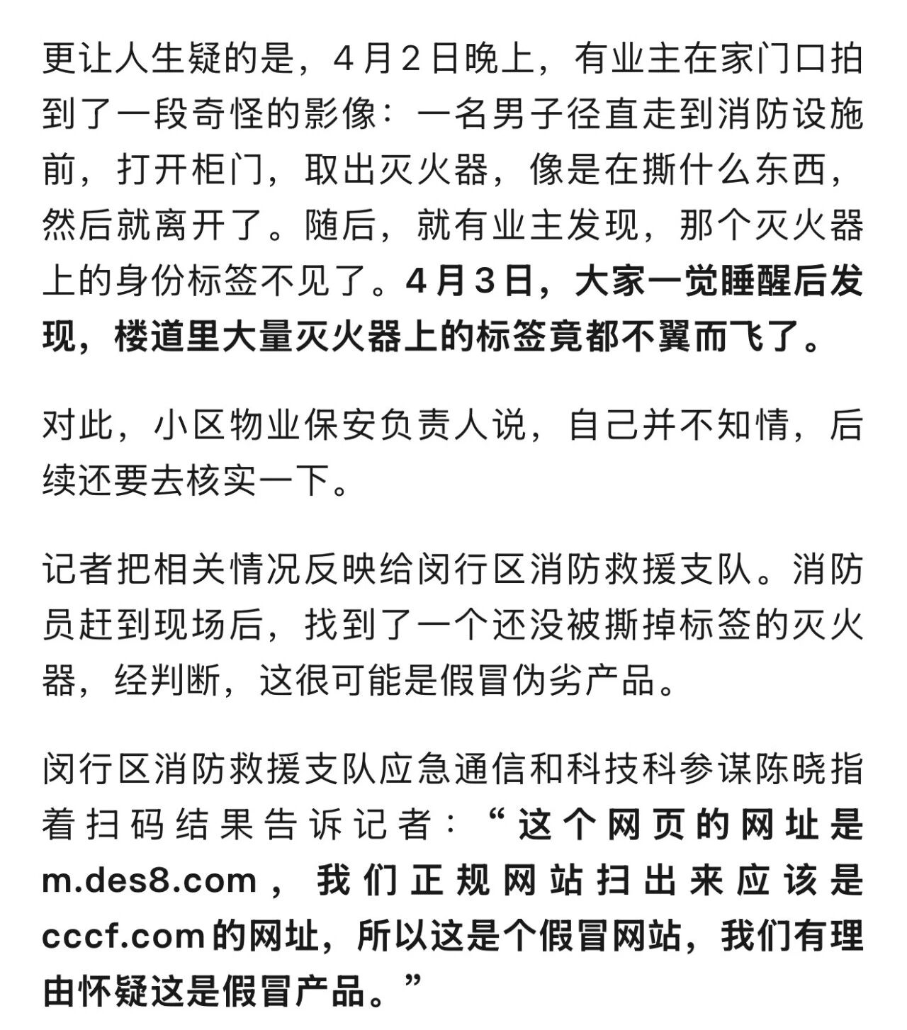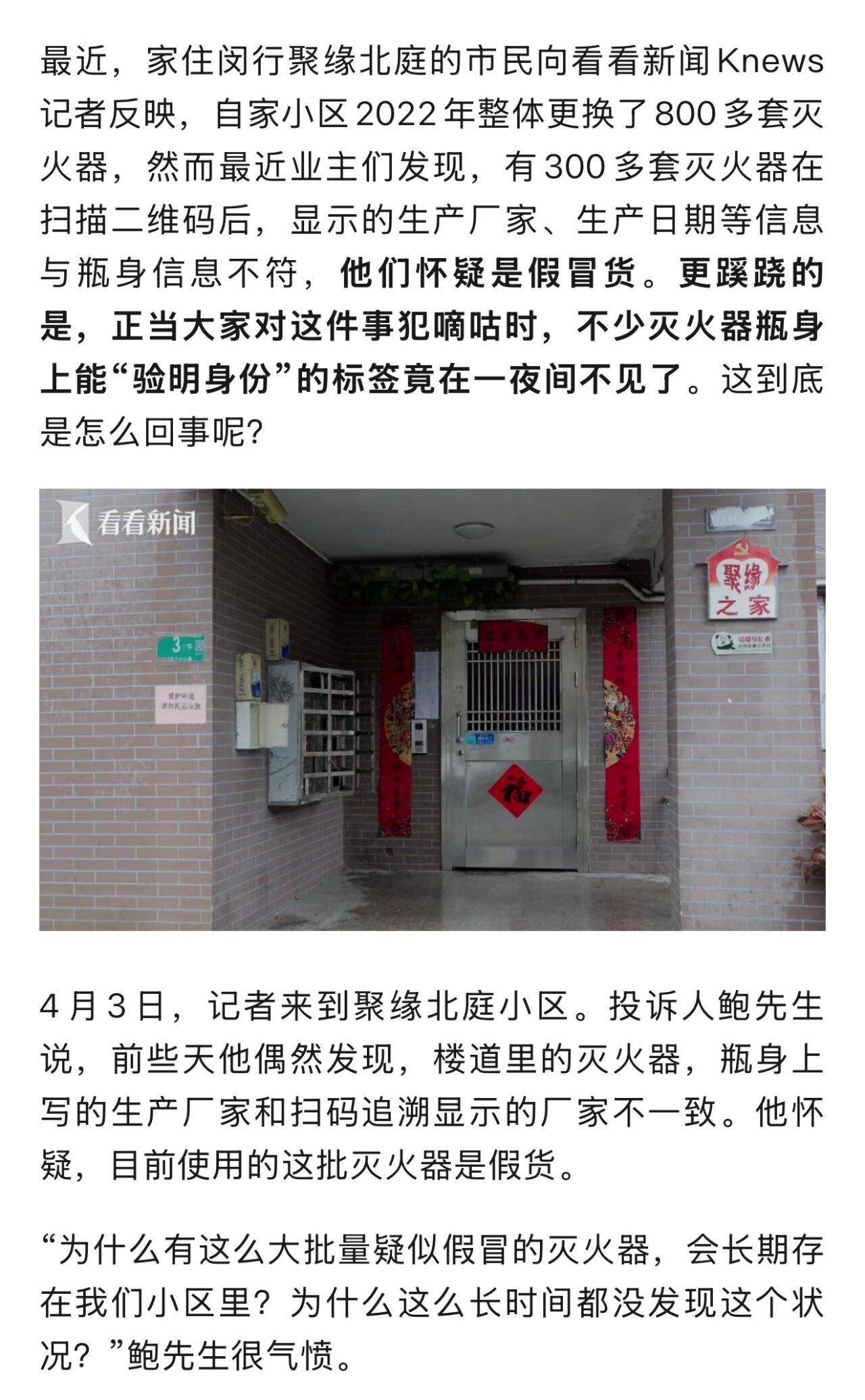 鲍先生说,前几天发现这个情况后,业主们就自发对全小区的灭火器进行了一次排摸,结果发现类似情况不是偶然。初步估算,有问题的灭火器可能超过三百个。“我们很多业主都通过扫码自查自己楼栋的灭火器,发现显示的信息跟瓶身上面的标识不一样。我们总共有38栋楼,其中17栋楼的灭火器都是这个型号的。”